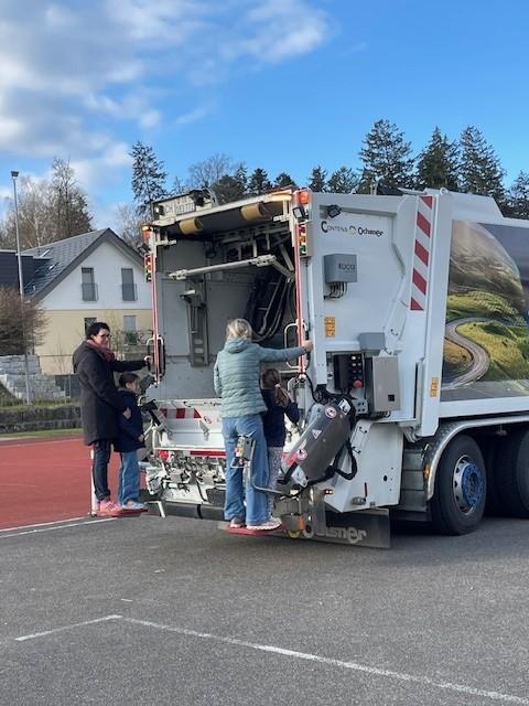 Anschliessend durften die Kinder selbst aktiv werden und verschiedene Materialien entsorgen, die sie während der Lagerwoche gesammelt hatten. Mit grossen Augen verfolgten sie, wie der Abfall im „Schlund“ des Kehrichtfahrzeugs verschwand. Einige besonders Neugierige durften sogar einen grossen Container leeren – das Leuchten in ihren Augen sprach Bände.