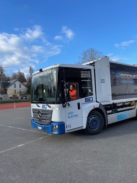 Am Montagmorgen, 31. März 2025, um 8:30 Uhr, fuhr das Entsorgungsteam mit dem neuen Elektro-Kehrichtfahrzeug auf den Pausenplatz der Schule Hubersdorf.